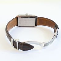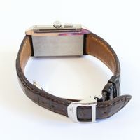 JAEGER-LECOULTRE, Reverso Duoface. Montre de forme rectangulaire réversible. Référence 272.8.54. Boîtier en acier signé et numéroté 2276465. Côté recto : cadran argenté à chiffres arabes, aiguilles glaives bleuies. Côté verso : cadran anthracite à compteur 24h. Mouvement mécanique à remontage manuel. Dimensions : 26 x 42 mm environ. Bracelet en cuir (*) signé avec boucle déployante en acier signée. Sans écrin ni papiers.