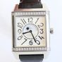 JAEGER-LECOULTRE, Reverso Squadra Duetto. Montre de forme rectangulaire réversible. Référence 235.8.76. Boîtier en acier signé et numéroté 2811679. Côté recto : cadran argenté à chiffres arabes, guichet date à 6h, serti de diamants. Côté verso : cadran noir avec masse visible au centre. Mouvement quartz. Dimensions : 29 x 42 mm environ. Bracelet en cuir (*) signé avec boucle déployante en acier signée. Sans écrin ni papiers, trois bracelets en cuir signés supplémentaires.