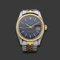ROLEX, Datejust. Montre de forme ronde. Vers 1973. Référence 1601. Boîtier en acier signé et numéroté 3417900. Lunette en or 585 millièmes. Cadran bleu à index appliqués, points et aiguilles luminescents, guichet date à 3h. Mouvement mécanique à remontage automatique signé. Calibre 1570. Diamètre : 36 mm environ. Bracelet Jubilee en acier et maillons centraux en or 585 millièmes avec boucle déployante signée, taille : 21 cm environ. Poids brut : 88,08 g. Non poinçonnable. Sans écrin ni papiers. E)(art524bis du CGI, al.C)