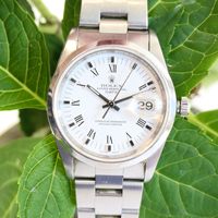 ROLEX, Oyster Perpetual Date. Montre de forme ronde. Référence 15200. Vers 2006. Boîtier en acier signé et numéroté Z342250. Cadran blanc à index appliqués et chiffres romains, points et aiguilles luminescents, guichet date à 3h. Mouvement mécanique à remontage automatique signé. Calibre 3135. Diamètre : 34 mm environ. Bracelet Oyster avec boucle déployante en acier signée, taille : 18 cm environ. Boîte, sans papiers.