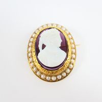 Broche ovale : en or 750 mil. centrée d'un camée sur pierre imitation entouré de demi-perles de culture (dimensions : 4 x 3,7 cm) (petits manques, soudures). 13,6 g. brut.