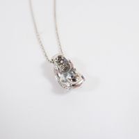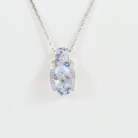 MAUBOUSSIN "Eternité élégance" : Collier en or gris 750 mil. à maillons forçat limé retenant un pendentif serti d'une aigue-marine ovale épaulée de petits saphirs et de petits diamants taille brillant (dimensions du pendentif : 2 x 0,9 cm ; longueur du collier : 43 cm), signé et numéroté. 7,1 g. brut.