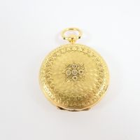 Travail de la 2nde moitié du XIXème siècle : Montre de col en or 750 mil., le dos ciselé et guilloché serti de roses, le couvercle émaillé vert et noir serti de roses, le cadran émaillé blanc à chiffres romains noirs (diamètre : 30 mm) (pierres manquantes, émaille accidenté). 21,2 g. brut.