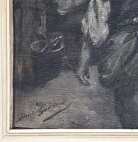 Gabriel GUERIN (1869-1916) "La harangue au café" Huile sur toile. Signée en bas à gauche. Dimensions : 27 x 18 cm. (Encadrée)