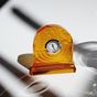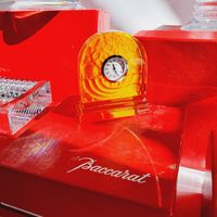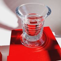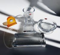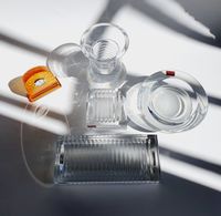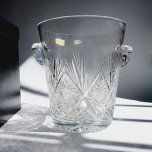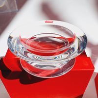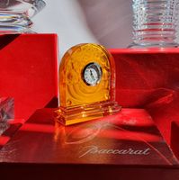 BACCARAT, XXème - XXIème siècles, Ensemble de 5 pièces en cristal transparent blanc comprenant : - par Savinel & Rozé, 1 porte-crayon modèle Lalande, cachet sous la base, haut. 10,5 cm environ, TBE, avec boîte de la maison, - pendulette de bureau de forme borne en cristal moulé pressé Cognac à décor de deux cornes d’abondance florale dans le style Art Déco, signée sur la terrasse et cachet sous la base, la montre ronde incorporée à quartz, haut. 7.7 cm. environ, dim. à la base : 7 x 2,6 cm, TBE, avec boîte de la maison, - vide-poche à rapprocher du modèle Lalande, cachet sous la base, long. 18,5 cm, largeur 8,2 cm, TBE, avec boîte de la maison, - cendrier à rapprocher du modèle Lalande, de forme carré, cachet sous la base, long. 7,9 cm, TBE, avec boîte de la maison, - cendrier à rapprocher du modèle Vega de forme ronde, le pied souligné d'un filet fort géométrique, largeur : 12,8 cm, TBE, avec boîte de la maison.