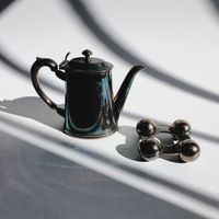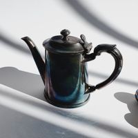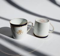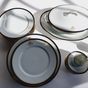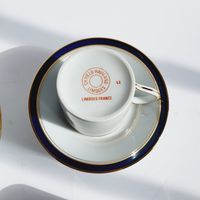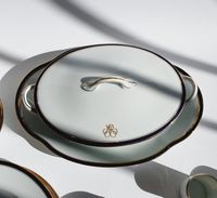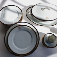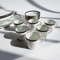 Ch. FIELD, HAVILAND à LIMOGES, modèle "filets", XXème siècle : Partie de service en porcelaine blanche à filets or et bleu, monogrammé "MR" comprenant : - 1 légumier et son dormant, largeur du dormant : 36,3 cm environ, - 6 grandes assiettes, diam. 25,5 cm environ, - 6 assiettes de taille moyenne, diam. 21,7 cm environ, - 6 assiettes à dessert, diam. 19 cm environ, - 6 tasses litrons, haut. 5,7 cm environ, - 6 sous-tasses, diam. 11,5 cm environ, Cachet sous la base et marque "Porcelaine Savary Paris". TBE. On y joint : CHRISTOFLE, fin du XIXème siècle - début du XXème siècle : 1 théière en métal argenté à décor de rinceaux stylisés, le bouton du couvercle souligné d'un filet, le piédouche souligné d'un ressaut. Signé et poinçon de qualité (1860 - 1935) et de métal blanc (1878 - 1935), Haut. 14 cm, Microrayures. On y joint également un dessous de plat en métal argenté formé de 4 boules reliées par un disque ajouré.