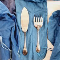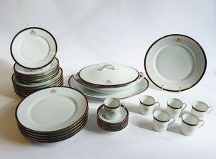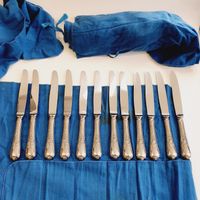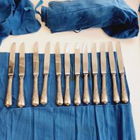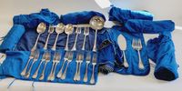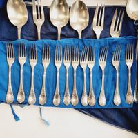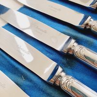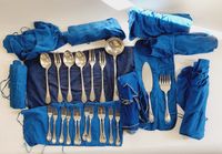 CHRISTOFLE, modèle Marly, XXème siècle : Importante ménagère de 119 pièces en métal argenté comprenant : - 12 grandes fourchettes - 12 grands couteaux, lame inox - 12 grandes cuillers - 12 fourchettes à entremets - 12 couteaux à entremets, lame inox - 11 cuillers à entremets - 12 fourchettes à poisson - 12 couteaux à poisson - 12 petites cuillers - 6 pièces de service - 2 pièces de service à poisson - 1 louche, poinçon "EPNS" Poinçons de maître (depuis 1935) et de qualité (1935-1983), Avec housses, Rayures et usures d'usage, lames repolies.