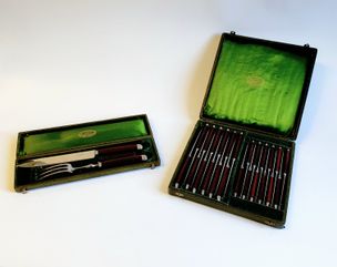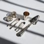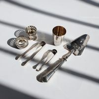 Ensemble de 6 pièces en métal argenté comprenant : - 1 pelle à tarte, le manche à décor filet contours polylobé, l'agrafe en palmette Art Déco, la pelle ajourée à décor de rinceaux, désargenture, - 1 coquetier et 1 rond de serviette à décor ajouré de croisillons, - 1 verre à liqueur à décor de filets horizontaux, - GULDEN (orfèvrerie d'Alsace), 1 pince à sucre à décor en métal argenté, - 1 pince à sucre à décor minimaliste.