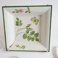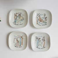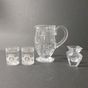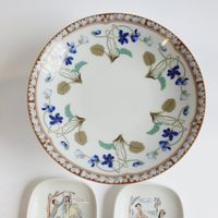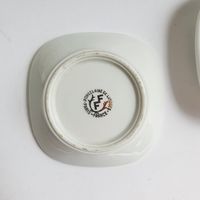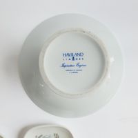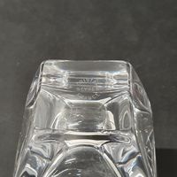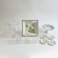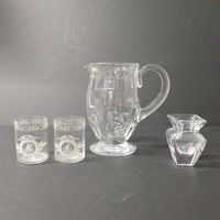 Ensemble de cristallerie et de porcelaines comprenant : BACCARAT, modèle Missouri : 1 broc à eau en cristal transparent taillé à décor méplats, cachet sous la base, Haut. 19 cm environ Microrayures, et usures. - CRISTAL SEVRES : 1 vase de forme balustre à section carré en cristal moulé pressé, Haut. 9 cm environ Microrayures. - Réunion des Musées Nationaux : 2 gobelets en verre transparent et à décor dépoli d'une lettre dans un cartouche rubané, et sur le bord d'une frise perlée, de rinceaux feuillagés et étoilés Haut. 8 cm environ Signé sous la base Microrayures. - LANCEL : 1 vide poche en porcelaine de forme carré à décor floral et papillon, Dim. 20 x 20 cm environ Signé sous la base. - PEYNET Raymond (1908-1999), d'après : PORCELAINE DE LIMOGES, 4 petits raviers en porcelaine à décor imprimé de scène de galanterie : Fleur et Amour, Escarpolette d'amour, Rencontre dans le Bois, Amour sur le lac. Dim. 7,8 x 7,8 cm environ Usures. - HAVILAND, Limoges : 1 coupe sur piédouche présentoir en porcelaine modèle Impératrice Eugénie à décor d'iris, ses feuillages et filets dorés, Haut. 15,8 cm environ.