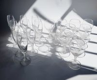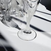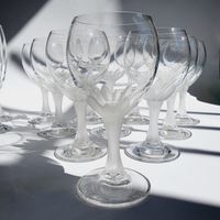 FRANCE, XXème - XXIème siècles, Suite de 10 verres à vin et 9 flûtes à champagne en cristal taillé à décor floral dépoli de la jambe à la paraison : Hauteurs respectives 16,4 cm environ et 20,4 cm environ, TBE.