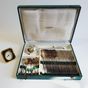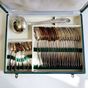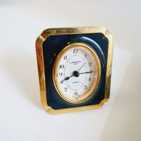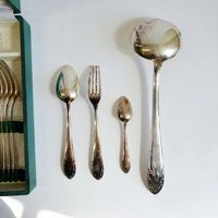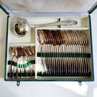 MANUFRANCE à SAINT-ETIENNE, XXème siècle : Partie de ménagère en métal argenté, le décor à rinceaux style Louis XV, la feuille s'achevant en légère pointe comprenant : - 12 grandes fourchettes, - 12 grandes cuillers, - 12 petites cuillers, - 1 louche Poinçon d'orfèvre, Usures, oxydations, avec écrin de la maison. On y joint : LANCEL PARIS, 1 pendulette-réveil en métal doré, lunette en résine et encadrement en résine bleu-vert, de forme rectangulaire, les angles bilobés, mouvement à quartz, haut. 9,9 cm environ, signé sur la cadran, et marque West Germany au revers.