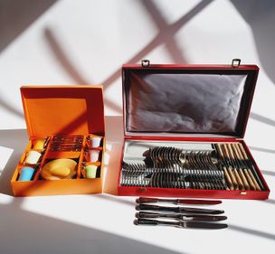 MANUFRANCE à SAINT-ETIENNE, XXème siècle : Partie de ménagère en métal argenté, le décor à rinceaux style Louis XV, la feuille s'achevant en légère pointe comprenant : - 12 grandes fourchettes, - 12 grandes cuillers, - 12 petites cuillers, - 1 louche Poinçon d'orfèvre, Usures, oxydations, avec écrin de la maison. On y joint : LANCEL PARIS, 1 pendulette-réveil en métal doré, lunette en résine et encadrement en résine bleu-vert, de forme rectangulaire, les angles bilobés, mouvement à quartz, haut. 9,9 cm environ, signé sur la cadran, et marque West Germany au revers.