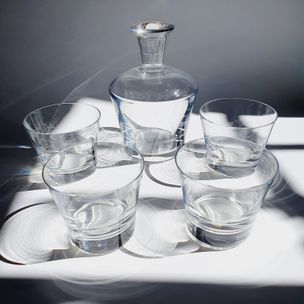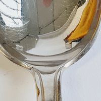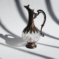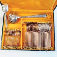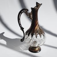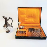"ORFÈVREVRIE LIBERTY : partie de ménagère de 37 pièces en métal argenté modèle filets dans le style Art Déco comprenant : - 12 grandes cuillers - 12 grandes fourchettes - 12 petites cuillers - 1 louche Poinçon d'orfèvre (à partir de 1928), Rayures, oxydations et usures d'usage, Dans un écrin usé. On y joint : ERNIE, Edouard (actif de 1882 à 1905 ?), fin du XIXème siècle - début du XXème siècle, 1 pichet en verre en forme de godrons spiralés, la monture en argent 950 mil. à décor rocaille spiralé de style Louis XV, Poinçons Minerve (1838-1974), et d'orfèvre Haut. 25,5 cm Poids brut : 751,3 g."