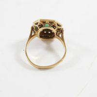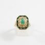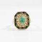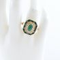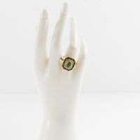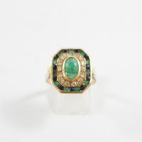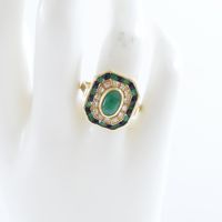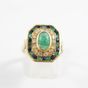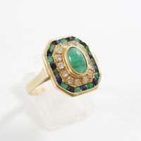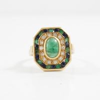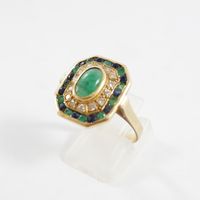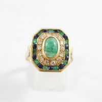Bague en or 750 mil à chaton rectangulaire à pans coupés centré d'un cabochon ovale égrisé d'émeraude entourée d'une ligne de diamants et d'une ligne de saphirs alternés d'émeraudes (égrisures) (Dim chaton : 18 mm x 16 mm ; TDD : 59 anneau déformée). 7,1 g brut.