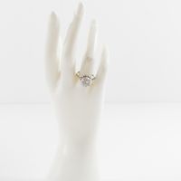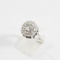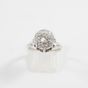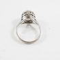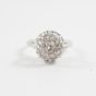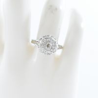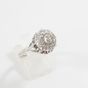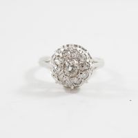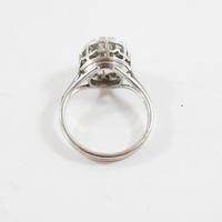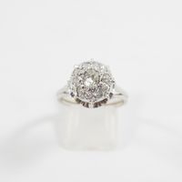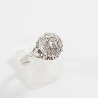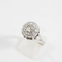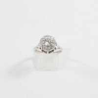 Bague en or gris 750 mil et platine 850 mil à chaton rond (Diam : 1,2 cm) orné de diamants TA (le central d'environ 0,15 ct ; 1 pierre accidentée) (TDD : 56). 5,4 g brut.