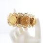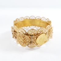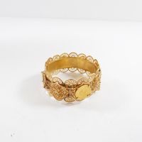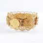 Bracelet rigide ovalisé en or 750 mil filigrané, rehaussé de 4 pièces en or 900 mil de 4 florins (François Joseph Autriche-Hongrie) (Diam intérieur : 6,6 x 7 cm environ). 68,4 g.