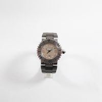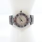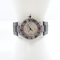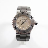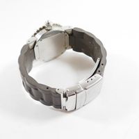 Montre de dame en acier sur bracelet caoutchouc (Long : 17 cm environ), boîtier rond à lunette tournante (Diam : 32 mm), cadran argenté à chiffres romains, points et guichet dateur à 6h (1 index à recoller) , CHAUMET, Class One, mouvement quartz.