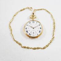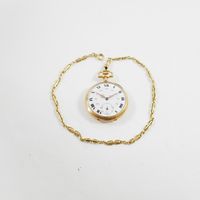 Montre de gousset en or 750 mil, boîtier rond (Diam : 46 mm), cadran blanc à chiffres romains, mouvement mécanique (petits chocs) et sa chaîne de montre à maillons fantaisie en or 750 mil (Long : 40 cm). 86,1 g brut.