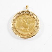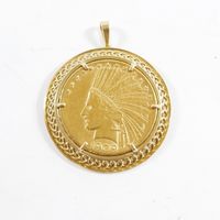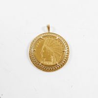 Pendentif rond ajouré (Diam : 36 mm) en or 750 mil centré d'une pièce de 10 US dollars en or 900 mil (Tête d'indien 1909). 22 g.