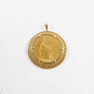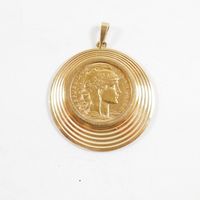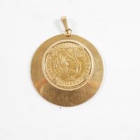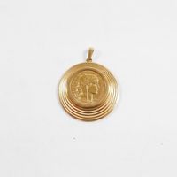 Pendentif rond godronné (Diam : 34 mm environ) en or 750 mil rehaussé d'une pièce de 20 frcs français en or 900 mil. 11,4 g.