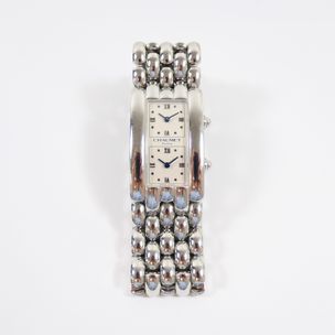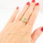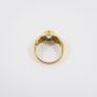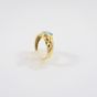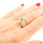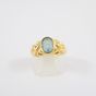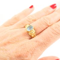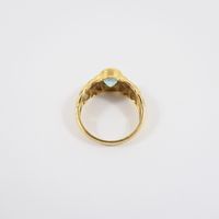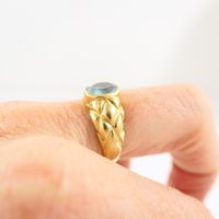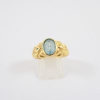 Bague jonc : en or 750 mil. à décor de croisillons centrée d'une topaze bleue ovale (TDD : 55 ; largeur : 9,2 mm) (chocs à la pierre). 5,2 g. brut.