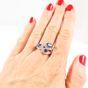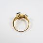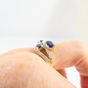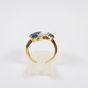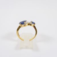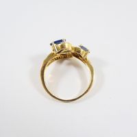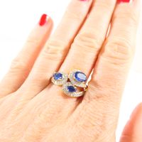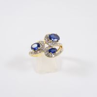Bague "volutes" : 2 ors 750 mil. sertie de 3 saphirs ovales entourés de diamants taille 8/8 (TDD : 61,5) (traces de mise à grandeur, égrisures). 5,9 g. brut.