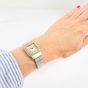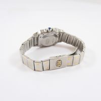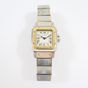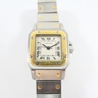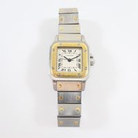 CARTIER Santos : Bracelet-montre de dame en acier et or 750 mil., boîtier carré (dimensions : 23 mm), lunette en or 750 mil. à décor de vis en acier, cadran blanc à chiffres romains noirs, mouvement automatique, sur bracelet en acier à décor de vis en or 750 mil. avec boucle déployante siglée (longueur : 15,5 cm), pierre imitation bleue sur le remontoir [E. : art. 524 bis du CGI al. C] (rayures, usures au niveau du bracelet, égrisures). 55,7 g. brut.