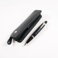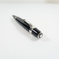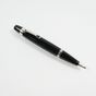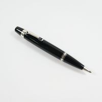 MONTBLANC "Bohème" : Stylo-bille en résine noire et métal blanc, avec pierre imitation noire sur l'agrafe (rayures). Avec étui en cuir MONTBLANC.