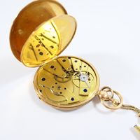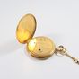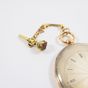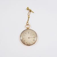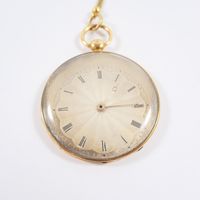 Montre de poche : extra plate en or rose 750 mil., le cadran gris guilloché à chiffres romains noirs, le dos guilloché, mouvement non d'origine. Porte le poinçon de la Maison Eugène WILLIERS horloger à Lyon. Circa 1820. Avec une clé agrémentée d'une chaînette en or 750 mil. (pierre décorative) (diamètre : 44 mm) (usures, accidents, manques, soudures). 47,8 g. brut.