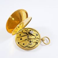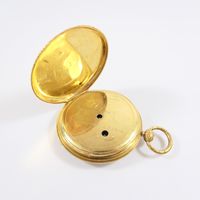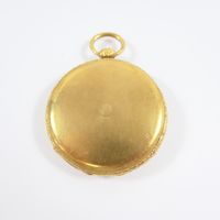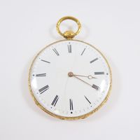 Montre de poche : en or 750 mil., le cadran émaillé blanc à chiffres romains noirs peints, la carrure à motifs floraux ciselé, le dos à motifs rayonnant guillochés (diamètre : 47 mm). Travail des années 1820-1830. (Email accidenté, petits chocs, rayures) (manque la clé). 62,9 g. brut.