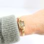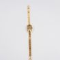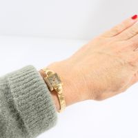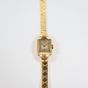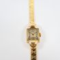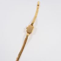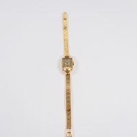 MOVADO : Bracelet-montre de dame en or 750 mil., boîtier carré (dimensions : 1,5 x 1,6 cm), cadran gris et crème à chiffres arabes et index points, mouvement mécanique signé, sur bracelet en or 750 mil. guilloché rapporté (longueur : 17,5 cm environ) (usures). 23,8 g. brut.
