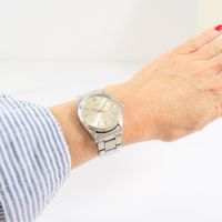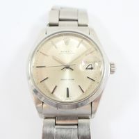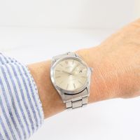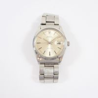 ROLEX "Oysterdate Precision" : Bracelet-montre en acier, boîtier rond (diamètre : 34 mm), cadran argenté à index appliqués, points et aiguilles luminescents, guichet date à 3h, mouvement mécanique à remontage manuel signé, sur bracelet à maillons oyster à boucle déployante en acier, signé (longueur : 15,5 cm environ) (verre rayé, usures).