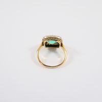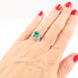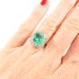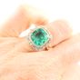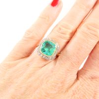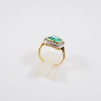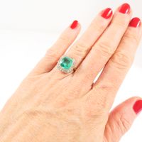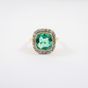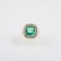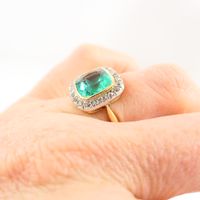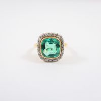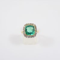 Seconde moitié du XIXème siècle : Bague en or 750 mil. et platine 850 mil. centrée d'une émeraude taille coussin de 2,5 ct environ dans un entourage de diamants taille ancienne (TDD : 48) (égrisures, légère déformation). 6,4 g. brut.