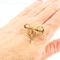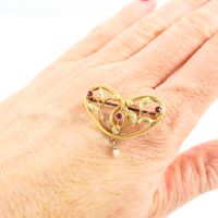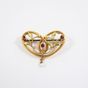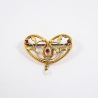 Travail français époque Art Nouveau : Broche "gui" en or 750 mil. ponctuée de pierres imitation et d'une perle fine, avec épingle en métal (dimensions : 2,9 cm x 2,4 cm). Possibilité de la porter en pendentif. 1,8 g. brut.