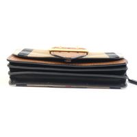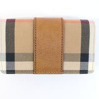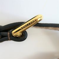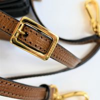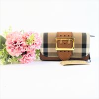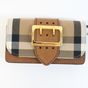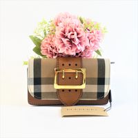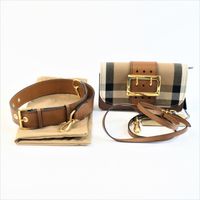 BURBERRY. Mini sac pochette « Madison The Buckle » 19cm : en cuir grainé marron, et toile House Check fermeture à pression sous rabat aimanté orné d'une importance boucle en métal doré sur lanière en cuir marron. Intérieur 2 compartiments et 1 grande poche centrale zippée; fentes pour cartes. On y joint une 2 anses bandoulière réglable amovible en cuir marron : 1 de 72cm de long et 4cm de large et 1 de 120cm de long et 1cm de large. Ht 11 x Larg 19 x Prof 5cm. Parfait état.. Très bon état.Dustbag