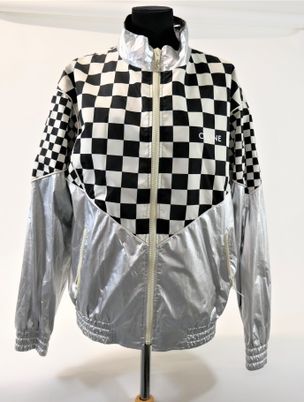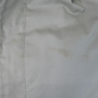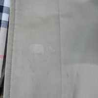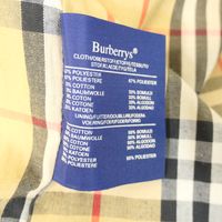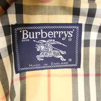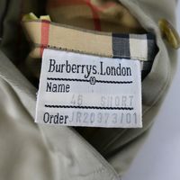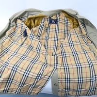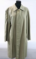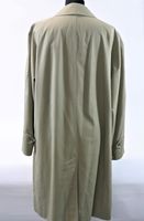 BURBERRYS'. Trench paletot : en gabardine de coton beige: petit col, simple boutonnage en sous patte à 5 boutons, poches verticales à rabat boutonné, pate de manches et fente boutonné, doublure tartan. Fermeture éclair pour doublure. Taille 46. Taches.
