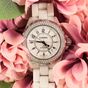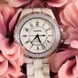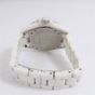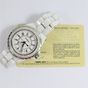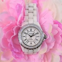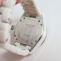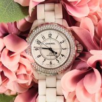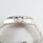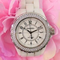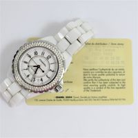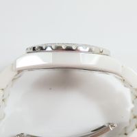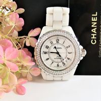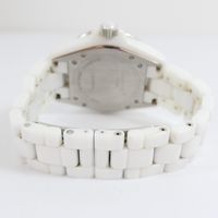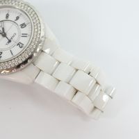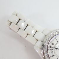 CHANEL. Bracelet montre "J12" Ref. H0969 : en céramique blanche et acier. Boitier rond (39 mm environ), lunette tournante unidirectionnelle pavée de 2 rangs de diamants. Cadran blanc, chiffres arabes en applique. Mouvement mécanique à remontage automatique, trotteuse centrale, guichet dateur à 4h30. Bracelet articulé en céramique blanc. Fermoir double dépliant, invisible à ouverture à ressort, signé Chanel. Tour de poignet : 15cm environ. Ecrin, carte d'authenticité et 3 maillons supplémentaires. Bon état général, rayures d'usage, petites salissures, lunette ne tourne pas.