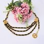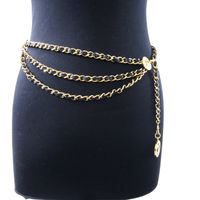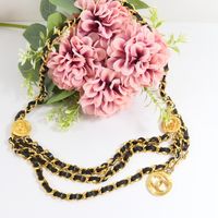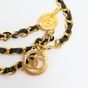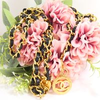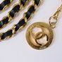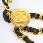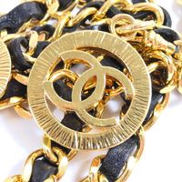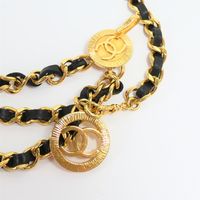 CHANEL. Collection 1984. Ceinture chaîne : en métal doré entrelacée de cuir noir, à trois rangs, retenus par deux motifs rayonnants siglés, se terminant par un médaillon repercé siglé en pendant. Siglée, datée. Long. totale: 83 cm. Très bon état. La ceinture chaîne entrelacée cuir et de métal doré est emblématique de la marque CHANEL, développée dans les années 1980 sous la direction de Karl Lagerfeld. On la retrouve dans les sacs (Timeless), montre (Première),...