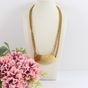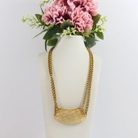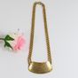 CHANEL Collection Printemps-Eté 1997. Collier plaque en métal doré :, orné d'une plaque gravée "CHANEL en diagonale (3,5 x7,5cm) , retenue par 2 rangs de chaîne. Plaque signature. Longueur : 52cm. Rayures, usures.
