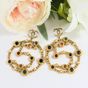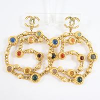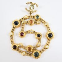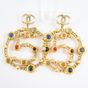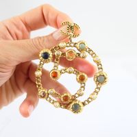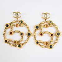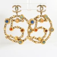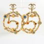 CHANEL. Paire de boucles d'oreilles "5", Collection Automne 2018 : en métal doré, perles imitation et perles de verre. Composée de l'emblématique chiffre 5 en maille gourmette surmonté du logo de la maison CC. Plaque signature. Haut. 7,5 x Larg.5,5cm. Légères usures, manque systèmes. Cette magnifique paire de boucles d'oreilles reprend les thèmes cher à la Maison CHANEL : Le chiffre 5 (chiffre fétiche de Coco CHANEL), la maille gourmette, les perles et perles de verre de couleur. Le chiffre 5 : comme le 5ème signe du zodiaque, celui de Gabrielle Chanel, comme son jour de prédilection pour présenter ses collections de couture, comme son numéro porte bonheur.5, la chance selon CHANEL.