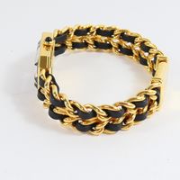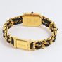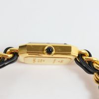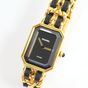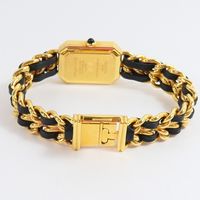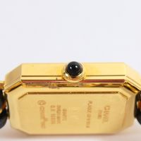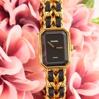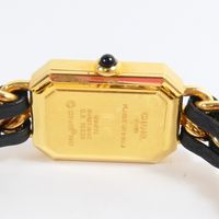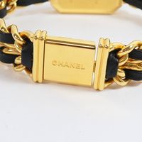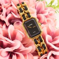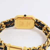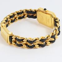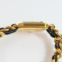 CHANEL Paris. Bracelet montre «Première» : Boîtier octogonal (26 x 20mm environ) en métal doré, cadran noir sans index, mouvement à quartz, fond clippé. Bracelet double rangs de chaîne en métal doré entrelacée de cuir noir. Remontoir serti d'un cabochon d'onyx. Signée. Année de création du modèle 1987. Tour de poignet 17cm environ. Taille L. Bon état général. Sans écrin, ni papiers. La montre Première de CHANEL iconique : Inspirée des codes de la Maison, cette création aux lignes singulières évoque le bouchon du parfum N°5. Le bracelet souple aux maillons entrelacés de cuir rappelle la chaîne du sac classique avec les deux couleurs de la Maison : le noir et l’or.