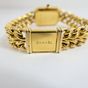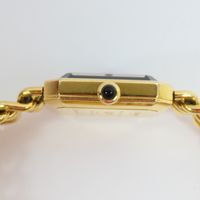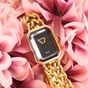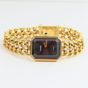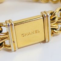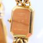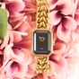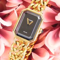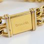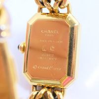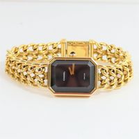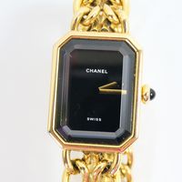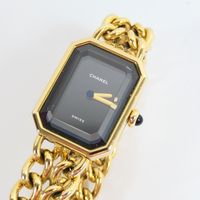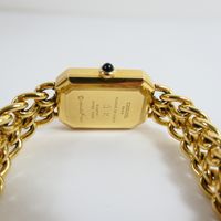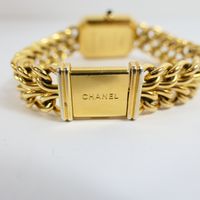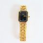 CHANEL Paris. Bracelet montre «Première» : Boîtier octogonal (26 x 20mm environ) en métal doré, cadran noir sans index, mouvement à quartz, fond clippé. Bracelet double rangs de chaîne en métal doré. Remontoir serti d'un cabochon d'onyx. Signée et numérotée. Année de création du modèle 1987. Tour de poignet 17cm environ. Taille L. Usures, pas de lanière en cuir noir. Sans écrin, ni papiers. La montre Première de CHANEL iconique : Inspirée des codes de la Maison, cette création aux lignes singulières évoque le bouchon du parfum N°5. Le bracelet souple aux maillons entrelacés de cuir rappelle la chaîne du sac classique avec les deux couleurs de la Maison : le noir et l’or.