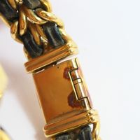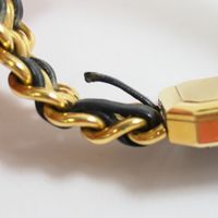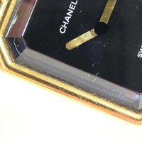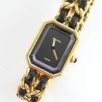 CHANEL Paris. Bracelet montre «Première» : Boîtier octogonal (26 x 20mm environ) en métal doré, cadran noir sans index, mouvement à quartz, fond clippé. Bracelet double rangs de chaîne en métal doré entrelacée de cuir noir. Remontoir serti d'un cabochon d'onyx. Signée et numérotée. Année de création du modèle 1987. Tour de poignet 16,5cm environ. Taille L. Rayures d'usage, lanières en cuir usées (à refixer sur l'arrière), traces d'oxydation, prévoir révision, ne fonctionne pas. Sans écrin, ni papiers. La montre Première de CHANEL iconique : Inspirée des codes de la Maison, cette création aux lignes singulières évoque le bouchon du parfum N°5. Le bracelet souple aux maillons entrelacés de cuir rappelle la chaîne du sac classique avec les deux couleurs de la Maison : le noir et l’or.