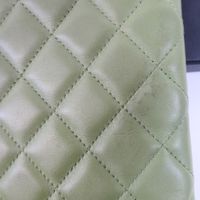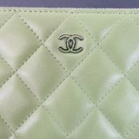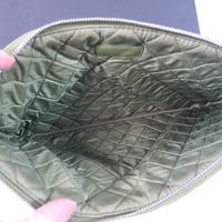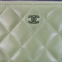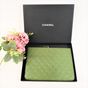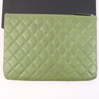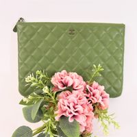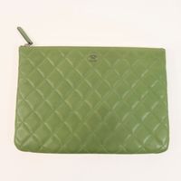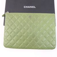 CHANEL. Pochette zippée classique en cuir matelassé vert : Fermeture zippée, garniture en métal argenté et émail vert. Porté main. Intérieur en toile verte matelassée. Numérotée. Circa 2015. Made in Italy. Ht 20 x Larg 27 x Prof 2cm. Boîte. Bon état quelques taches et salissures. Elégante, elle est parfaite pour ranger vos essentiels du quotidien