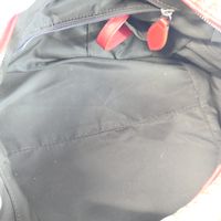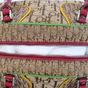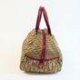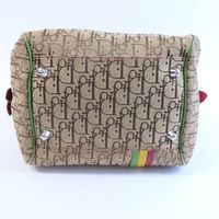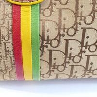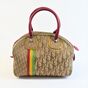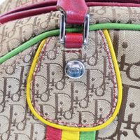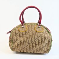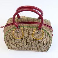 CHRISTIAN DIOR Paris. Sac Bowling collection "Rasta" par John GALLIANO : en toile monogram Oblique beige, cuir rouge, jaune et vert. Circa 2004. Fermeture éclair. Double anses en cuir rouge pour le porter à la main. Poche intérieure zippée. Doublure en nylon marron. Traces d'usures sur la ganse verte en dessous. Numéroté. Made in Italy. Quelques usures notamment aux coins. Ht 20 x larg 23 x Prof 21cm environ. Dustbag.
