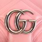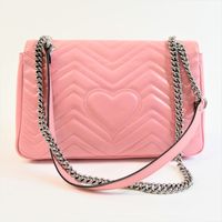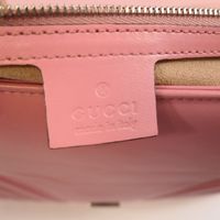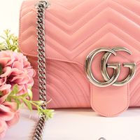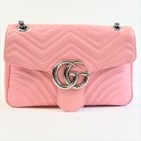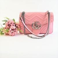 GUCCI made in Italy. Sac GG Marmont 30cm en cuir rose matelassé : fermeture à pression sous rabat siglé, anse bandoulière chaîne et cuir. Garniture en métal argenté. Doublure intérieure en suédine beige, une poche plaquée une poche zippée. Dos motifs chevrons et cœur matelassé. Numéroté. Ht 30 x Larg 19 x Prof 7cm environ. Bon état général, petite tache sous le rabat. Dustbag. La collection GG Marmont emblématique de la Maison Gucci se caractérise par: -le détail Double G sur le fermoir directement inspiré des boucles de ceinture d’une collection lancée par Gucci dans les années 70 -une bandoulière chaîne -et une construction en cuir exceptionnellement souple à décor de chevrons et d'un coeur au dos. Son nom fait référence au Château Marmont, un hôtel californien prisé des stars depuis les années 20. C’est le lieu de tous les excès : des fêtes grandioses et des secrets bien gardés ont façonné la réputation de cet endroit glamour et de ses très célèbres clients, parmi lesquels Marylin Monroe, Greta Garbo, James Dean, Jim Morrison ou plus récemment, Lady Gaga. Ce qui est certain, c’est qu’en quelques années d’existence, le petit sac Gucci a probablement été témoin d’autant de folies que les murs de l’hôtel mythique de Los Angeles !