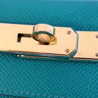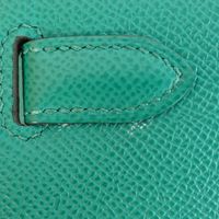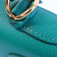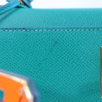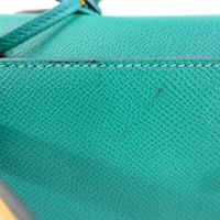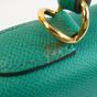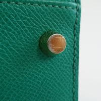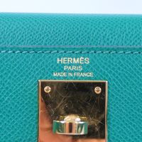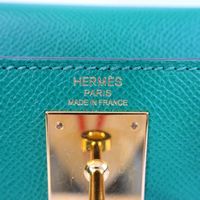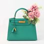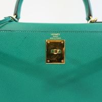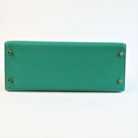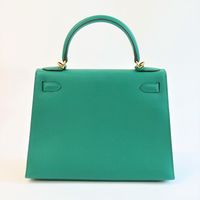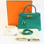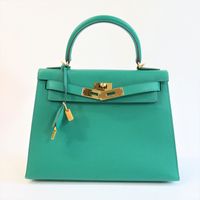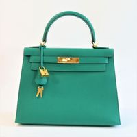 HERMES, année 2021. Sac « Kelly II Sellier » : Splendide sac Kelly II Sellier 28cm en veau Epsom vert jade, garniture en métal doré, fermoir pivotant sur double sanglon, poignée simple en cuir vert. Intérieur en cuir vert, une poche zippée, une double poche plaquée. Signature « Hermès Paris, Made in France. Tampon marque Z (2021). Anse bandoulière amovible. Deux clefs sous clochette, cadenas. Dans sa boite, dustbag (taché). Housse protection pluie, facture. Ht 22 x Larg 28 x Prof 11cm environ. Très bon état. Quelques petites taches à l'extérieur (1 devant, l'autre à coté du sanglon à l'arrière), sous le rabat, sous le sanglon, à l'intérieur, usures sous les pieds, rayures fermoir. Toute l'élégance française dans ce sac iconique, ponctuée d' une pointe d'originalité avec la couleur vert jade symbole de chance et de prospérité.
