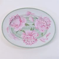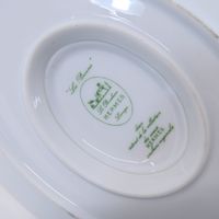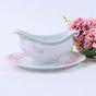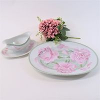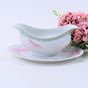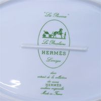 HERMES."Les Pivoines" : 1 plat ovale et 1 saucière en porcelaine blanche de Limoges à décor de pivoines roses sur fond de treillage vert. 36 x28cm (pour le plat) et 23 x 15 x 9cm (pour la saucière) environ. Bon état général, salissures. Décor extrait de la collection des carrés HERMES.