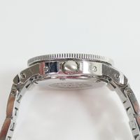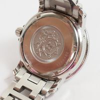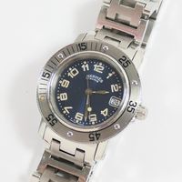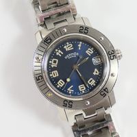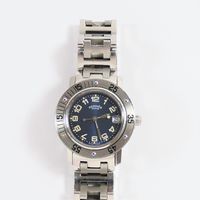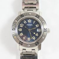HERMES Paris. Bracelet-montre "Clipper" Ref.CL5.210 : en acier. Boitier rond 27 mm, cadran bleu, chiffres arabes, dateur à 3H, aiguilles et index luminescents, lunette tournante, mouvement quartz. Bracelet en acier maillons en H, boucle déployante signée. Tour de poignet 15 cm environ. Sans écrin, ni papier.