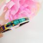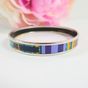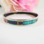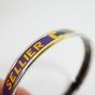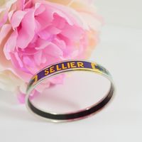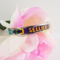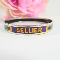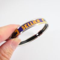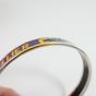 HERMES Paris. Bracelet "Sellier" jonc 10mm : en métal argenté émaillé à décor de sangles et de l'inscription "Sellier" dans les tons violet, vert, jaune, orange. Tour de poignet 20cm environ. Diamètre : 7cm. Quelques rayures, usures métal argenté.